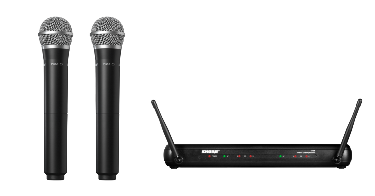 包括SVX88雙通道分集接收機,2個帶PG58話筒頭的手持發(fā)射機。